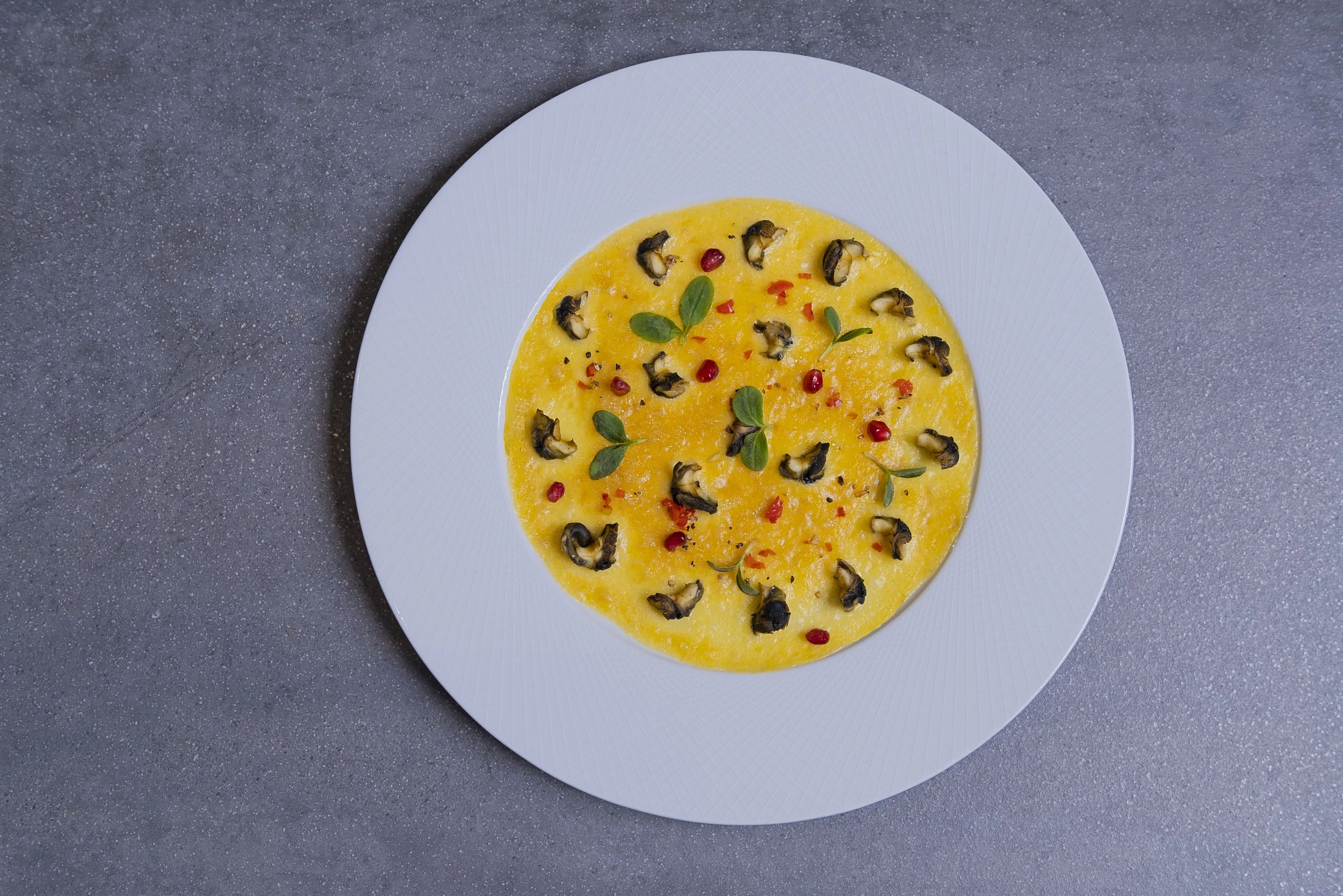 Une assiette blanche contenant une crème jaune garnie de tranches de champignons, de petits morceaux rouges, et de quelques feuilles vertes, sur une surface grisée.