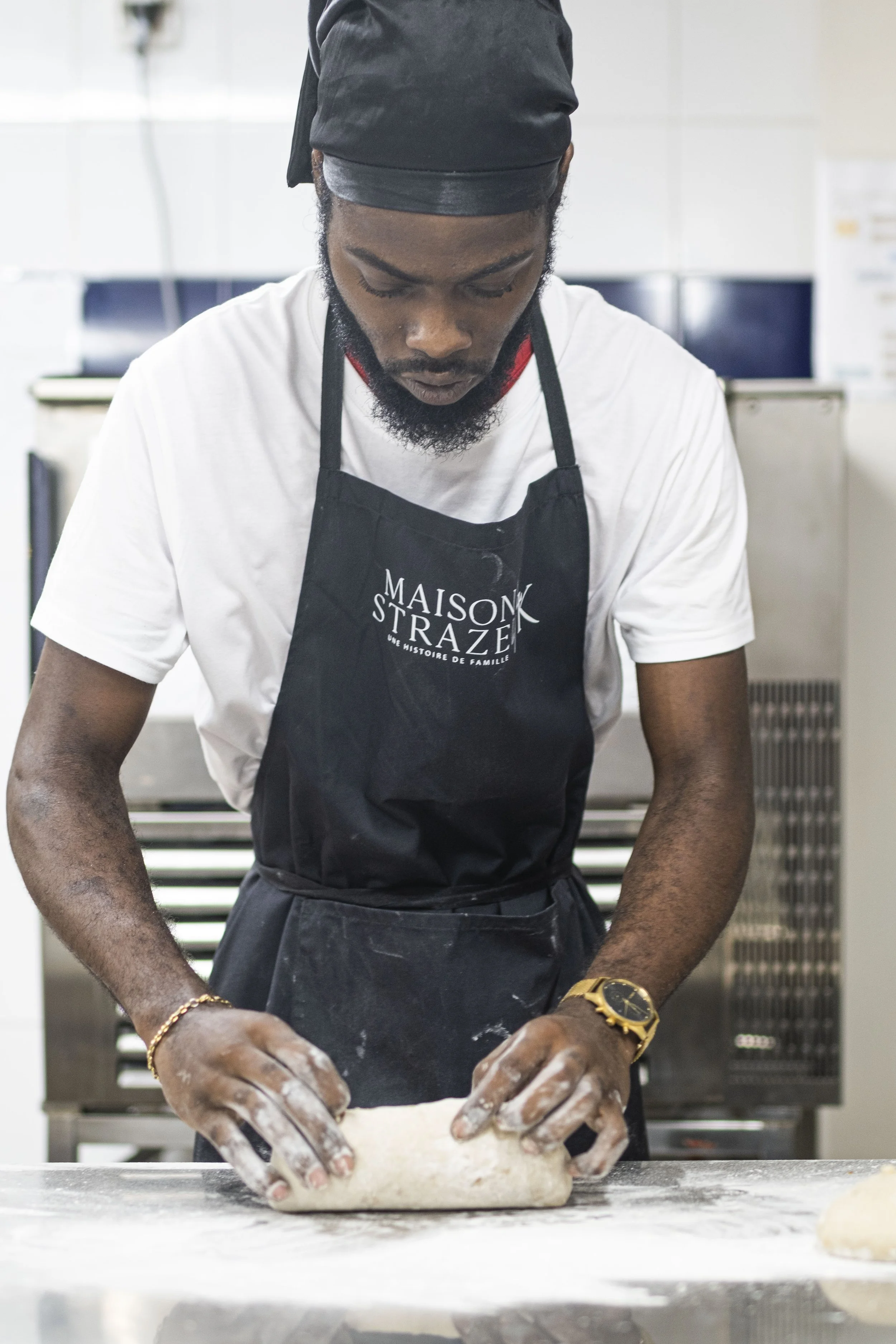 Un homme en tenue de cuisine, portant un tablier noir avec le logo 'Maison STRAZEL', travaille avec de la pâte sur un plan de travail dans une cuisine.