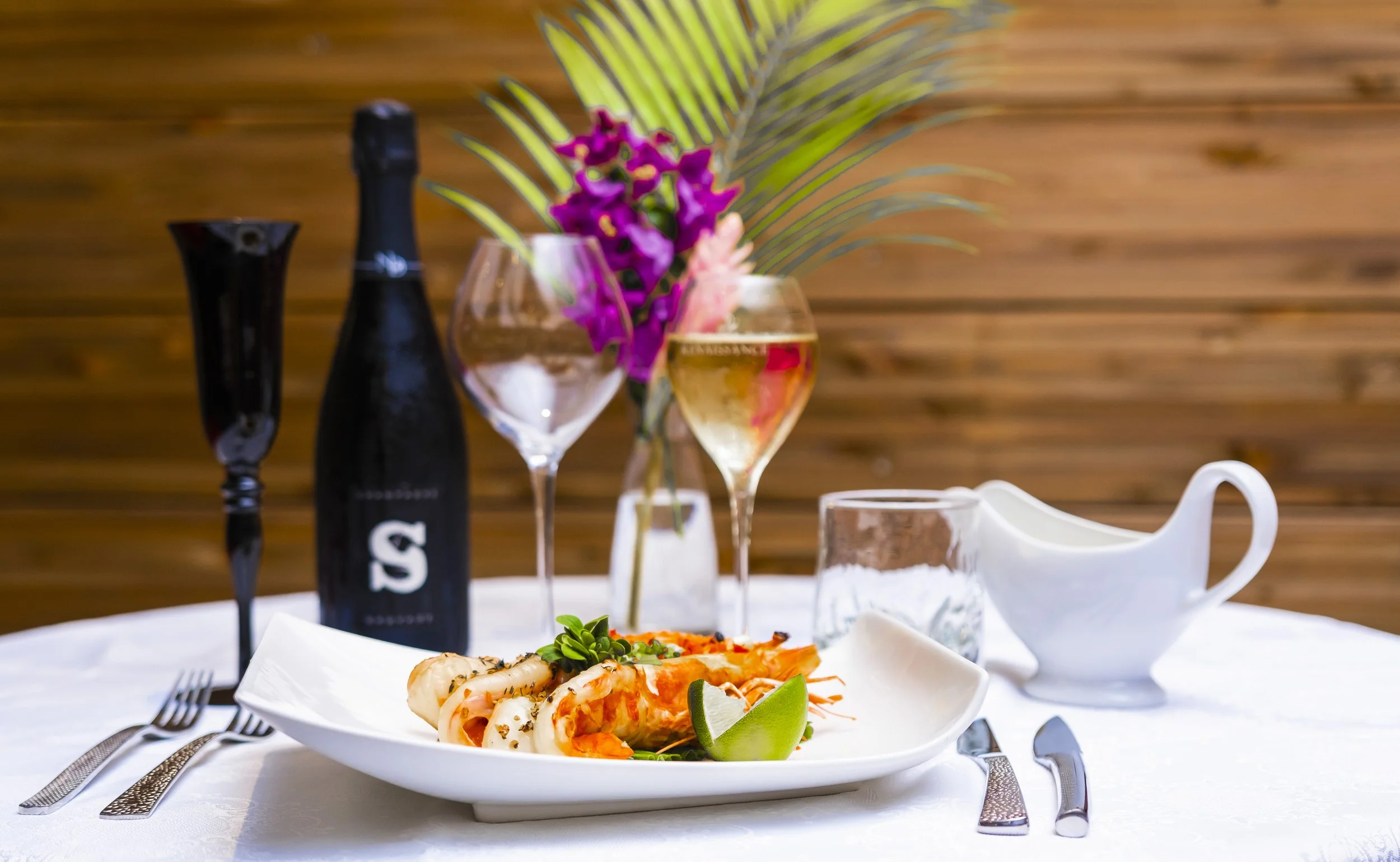 Une table de dîner avec un plat de fruits de mer, deux verres de vin blanc, une bouteille de champagne, une carafe d'eau, une vase avec des fleurs, et des couverts.