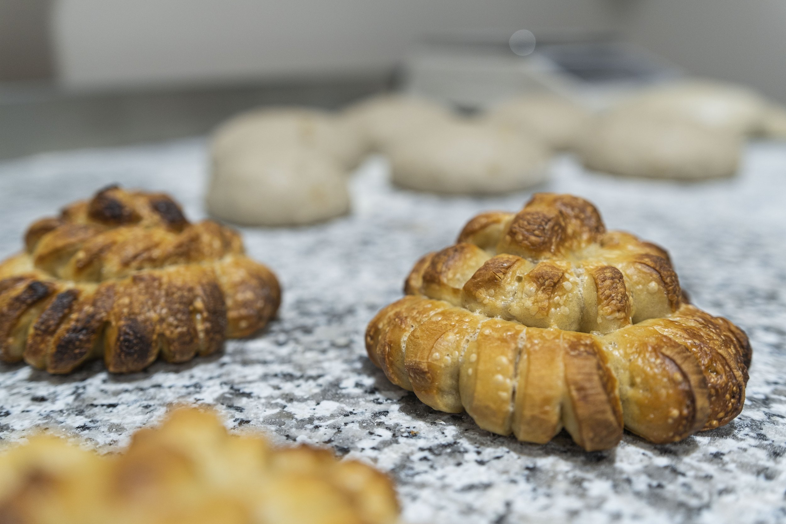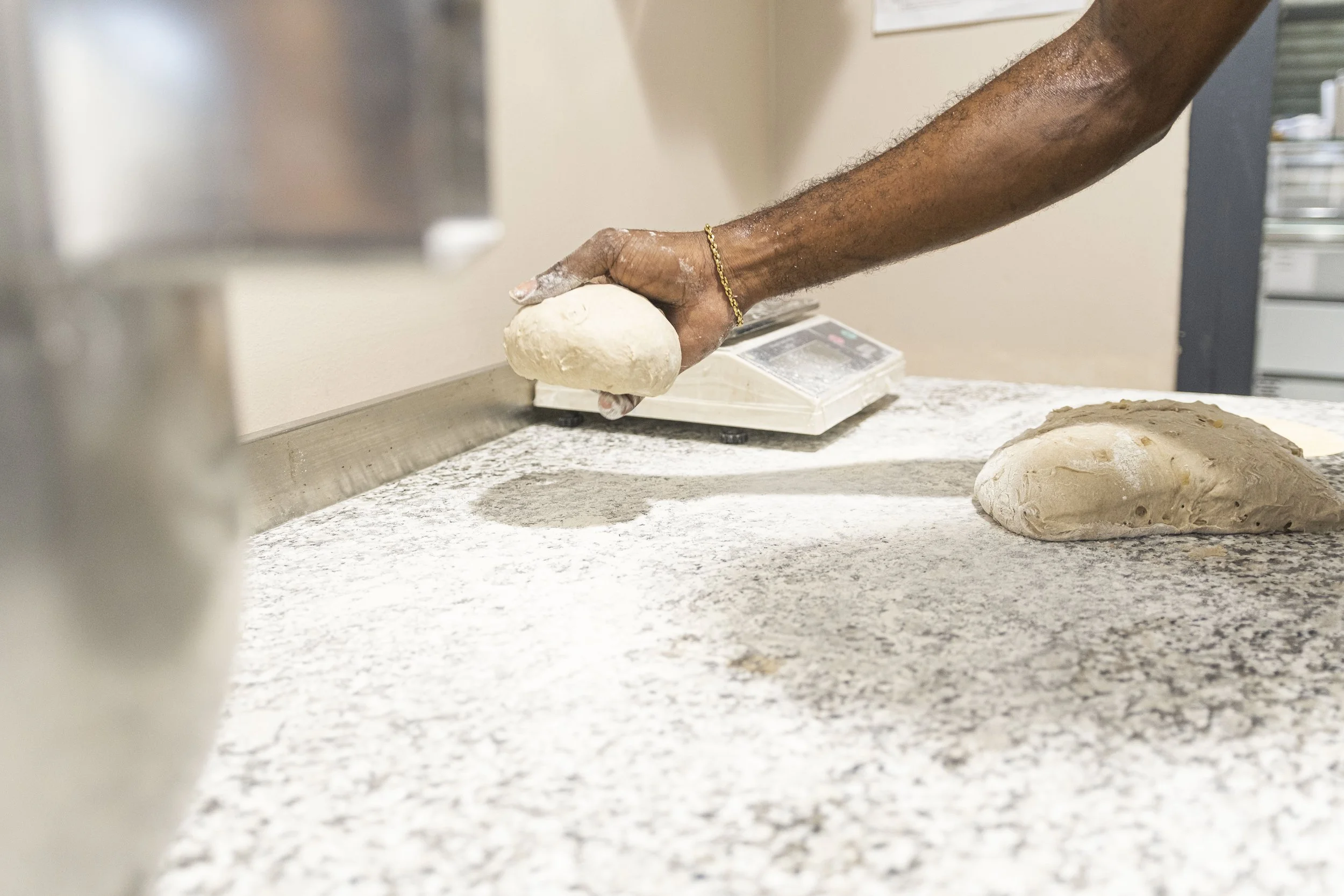 Une main masculine façonne une boule de pâte à pain sur un comptoir en marbre, avec une autre boule de pâte à pain sur le côté, dans une cuisine.