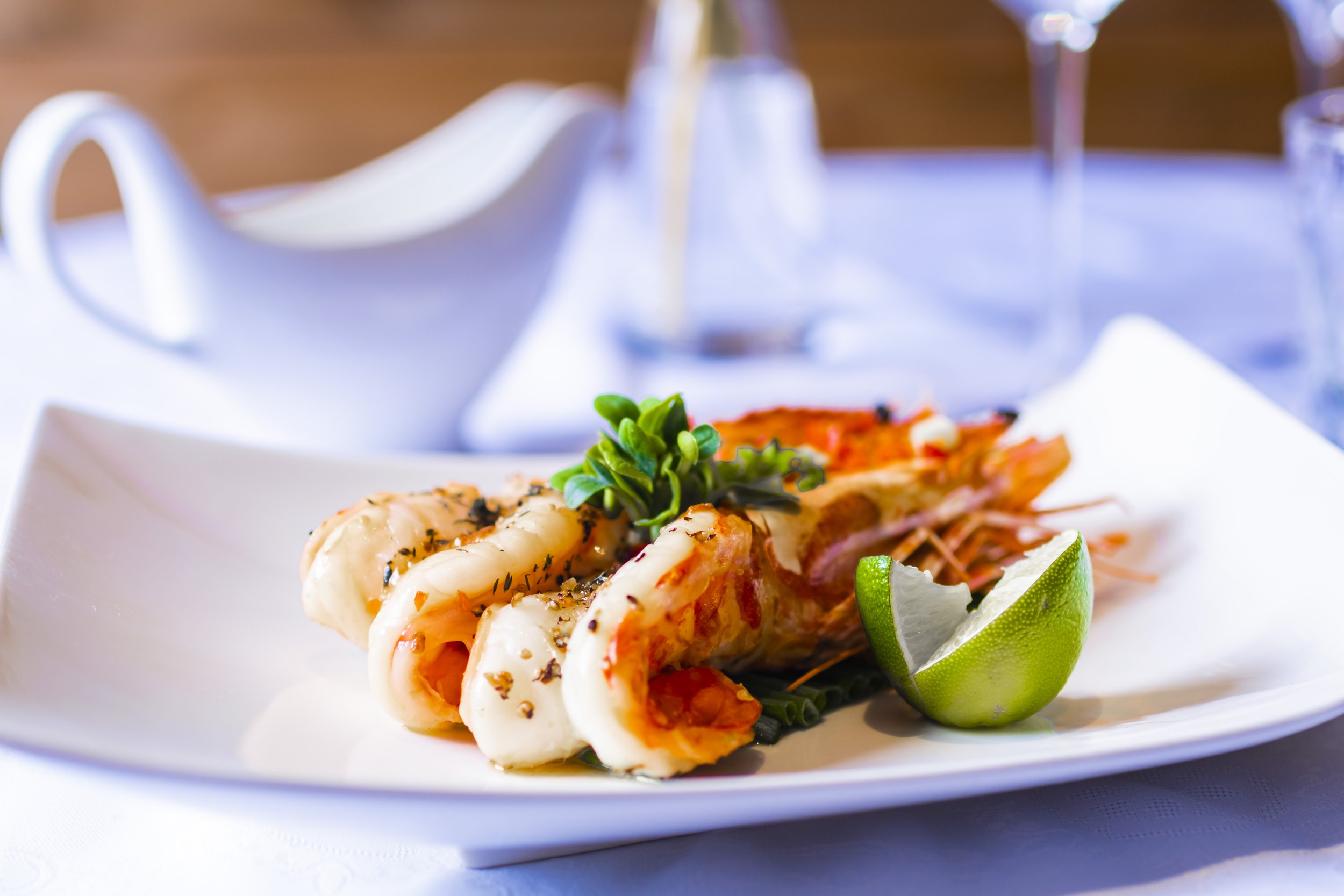 Plat de fruits de mer avec lime, sur une table avec des verres à vin et une vase avec des fleurs violettes et roses, dans une ambiance élégante.