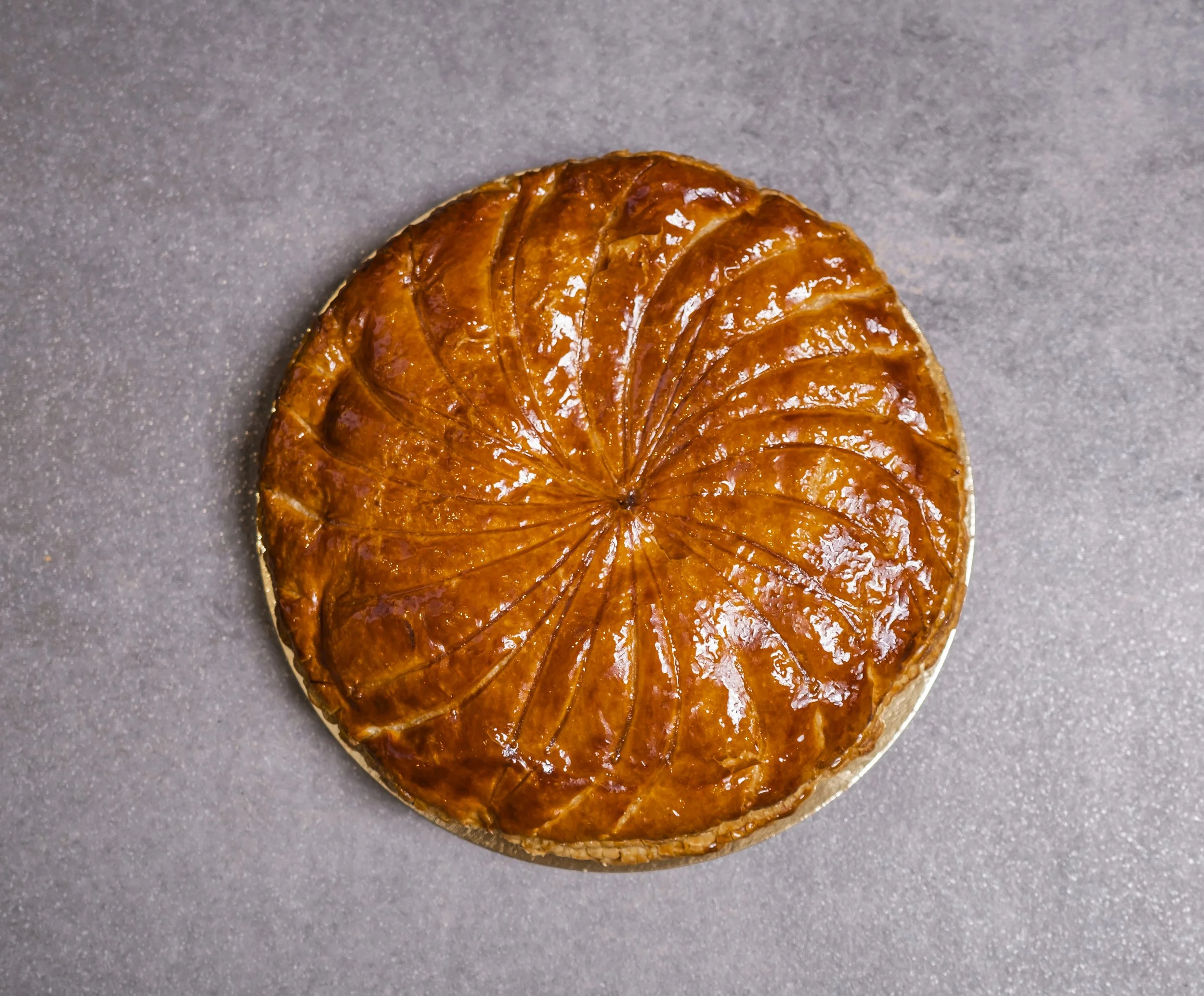 Tarte aux pommes dorée avec des tranches de pommes disposées en spirale sur le dessus, sur une surface grise.