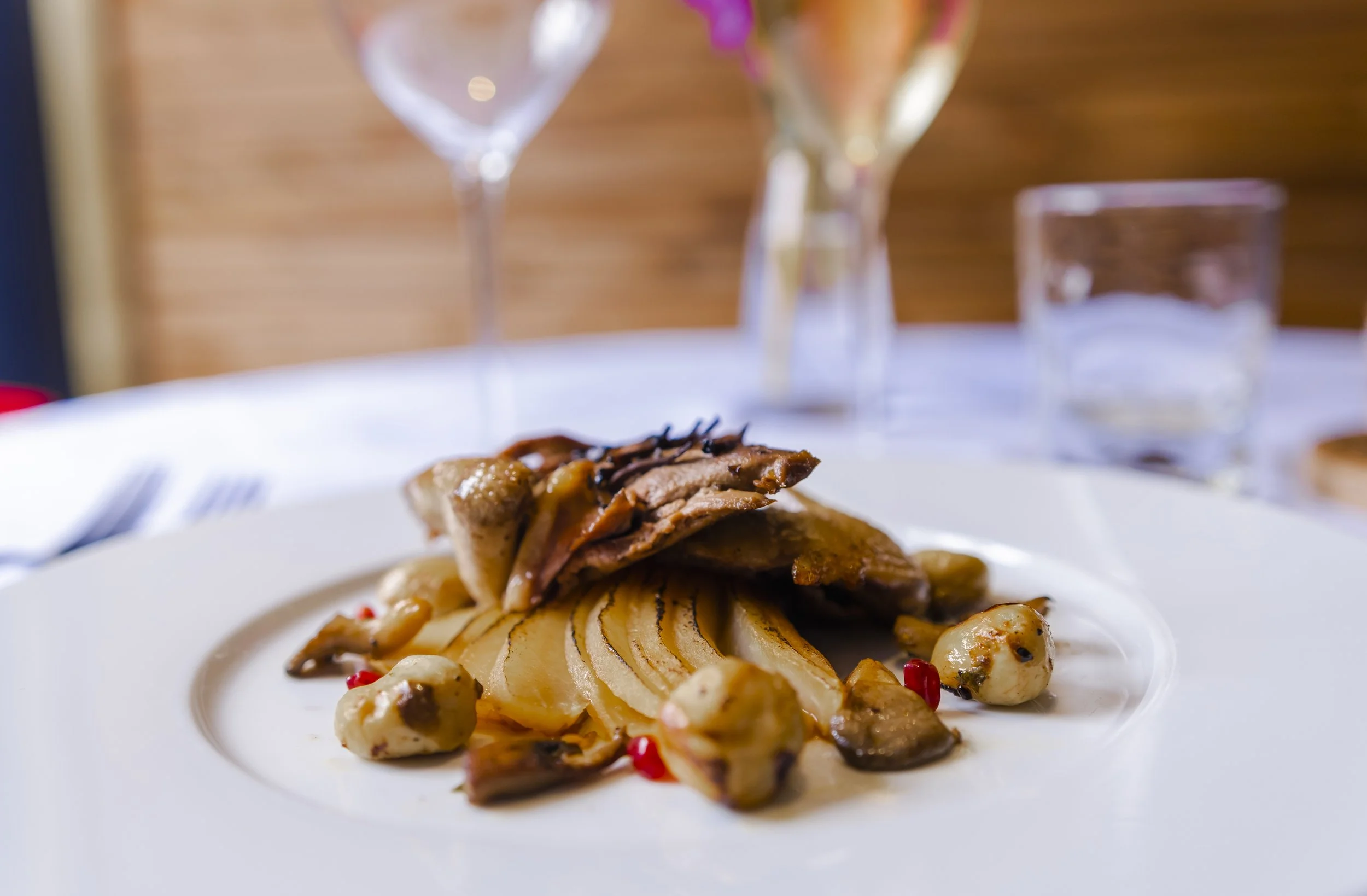 Gros plan sur un plat gastronomique avec des tranches de viande, des pommes de terre et des champignons, servi dans une assiette blanche dans un cadre de restaurant
